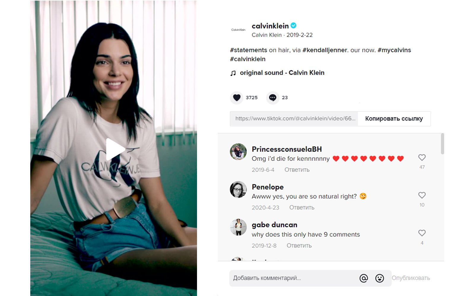 Calvin Klein был одним из первых модных брендов, разглядевших потенциал тиктока в качестве маркетингового инструмента для завоевывания более молодой и современной аудитории. Создав свой аккаунт в феврале 2019 года, он начал размещать на платформе короткие видеоролики с участием знаменитостей, в которых они делились правдивыми фактами о себе. Тренд быстро подхватили — сегодня у роликов с хэштегом #MyCalvins уже свыше 110 миллионов просмотров.