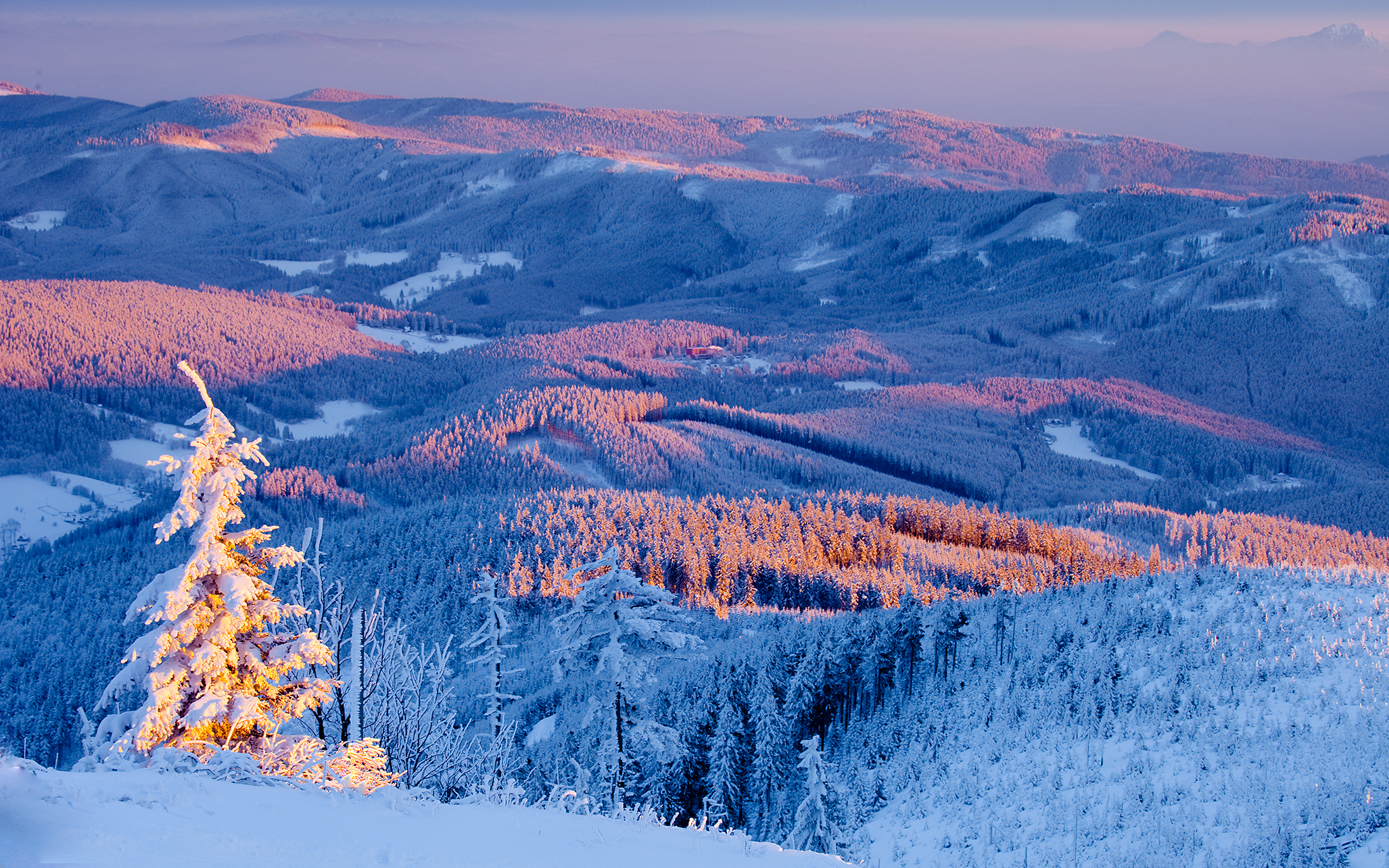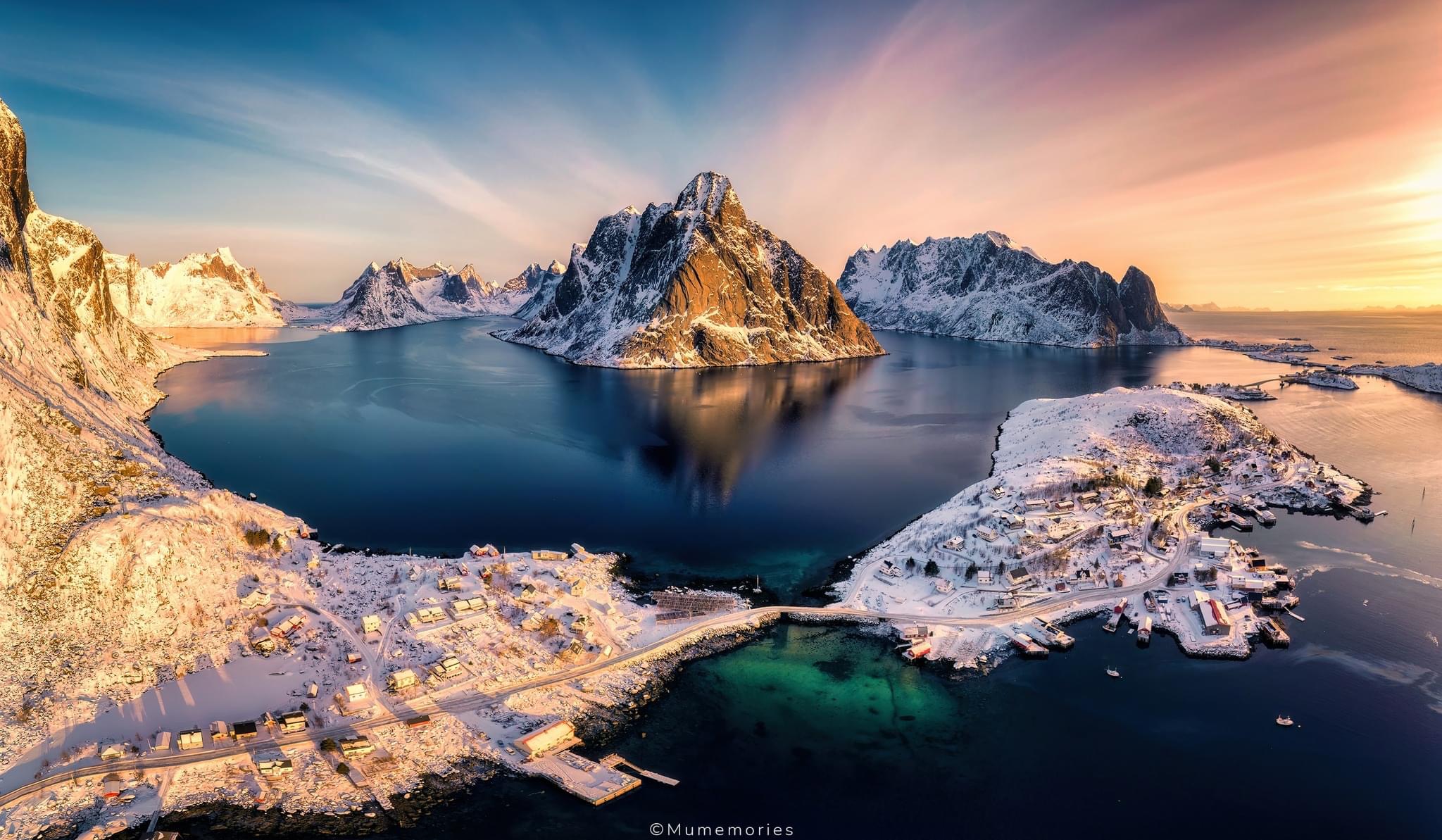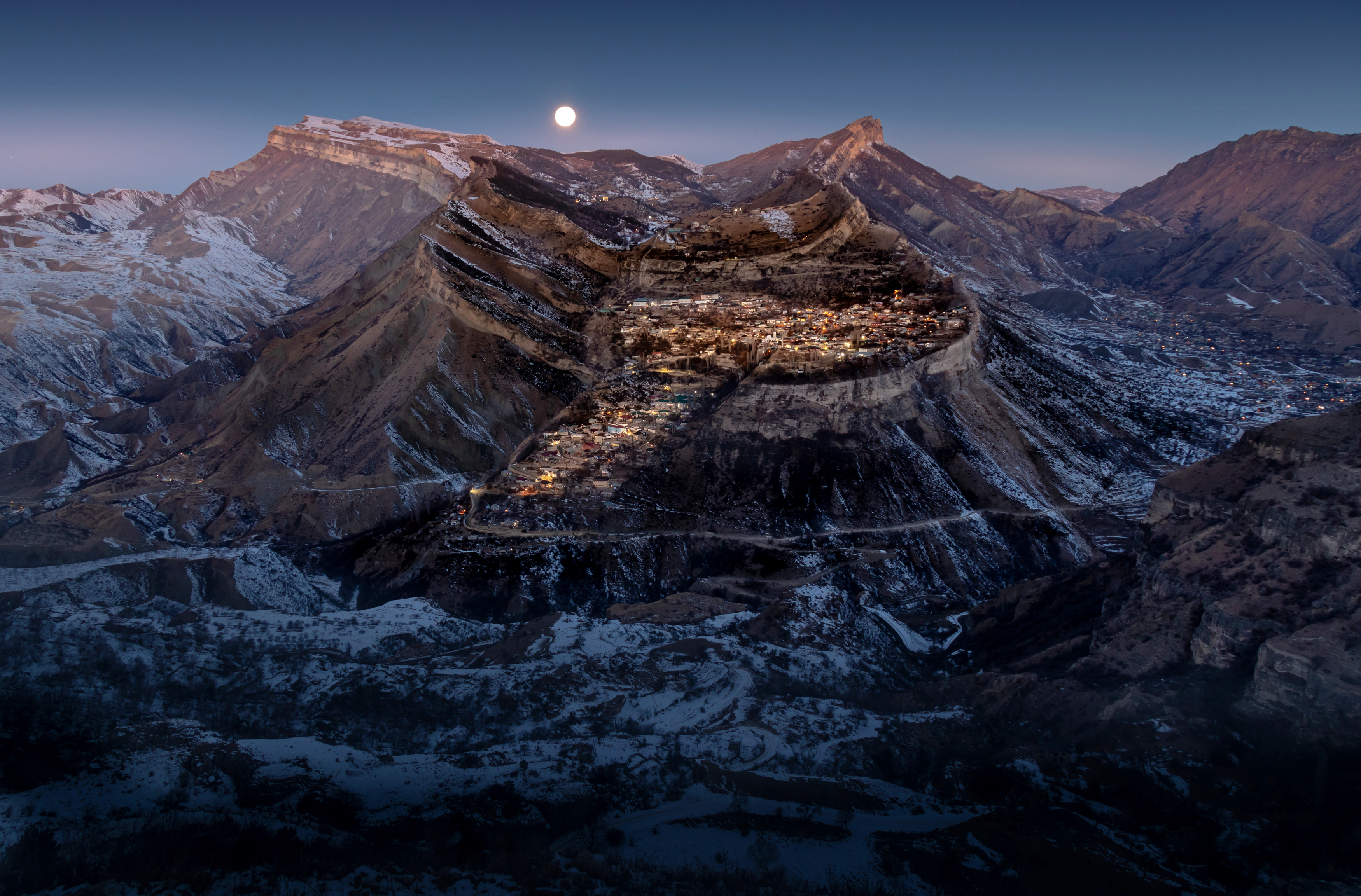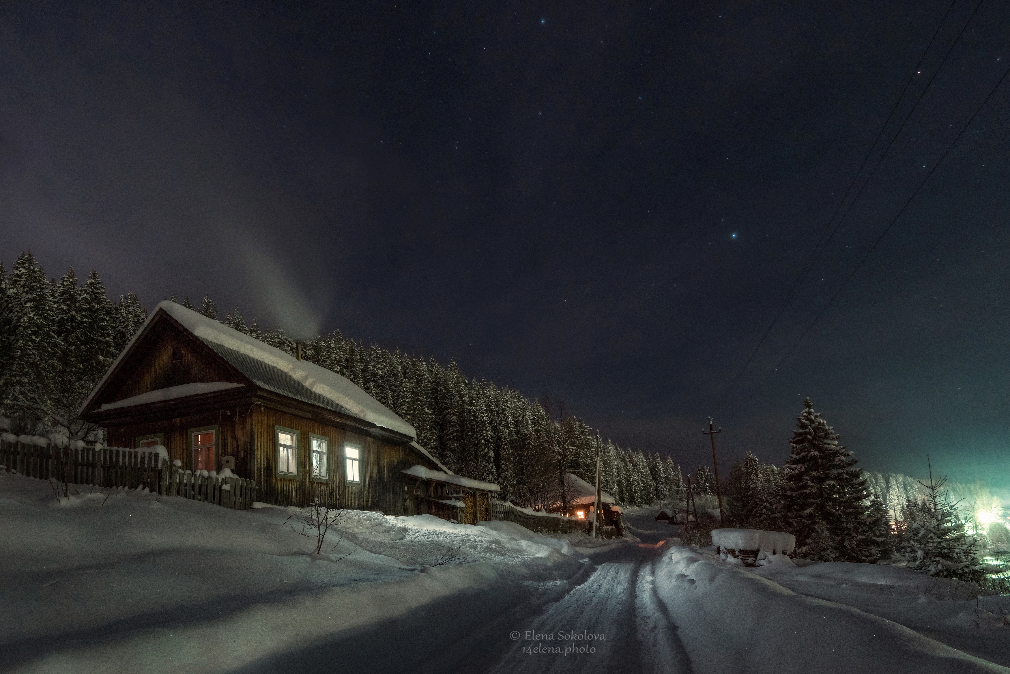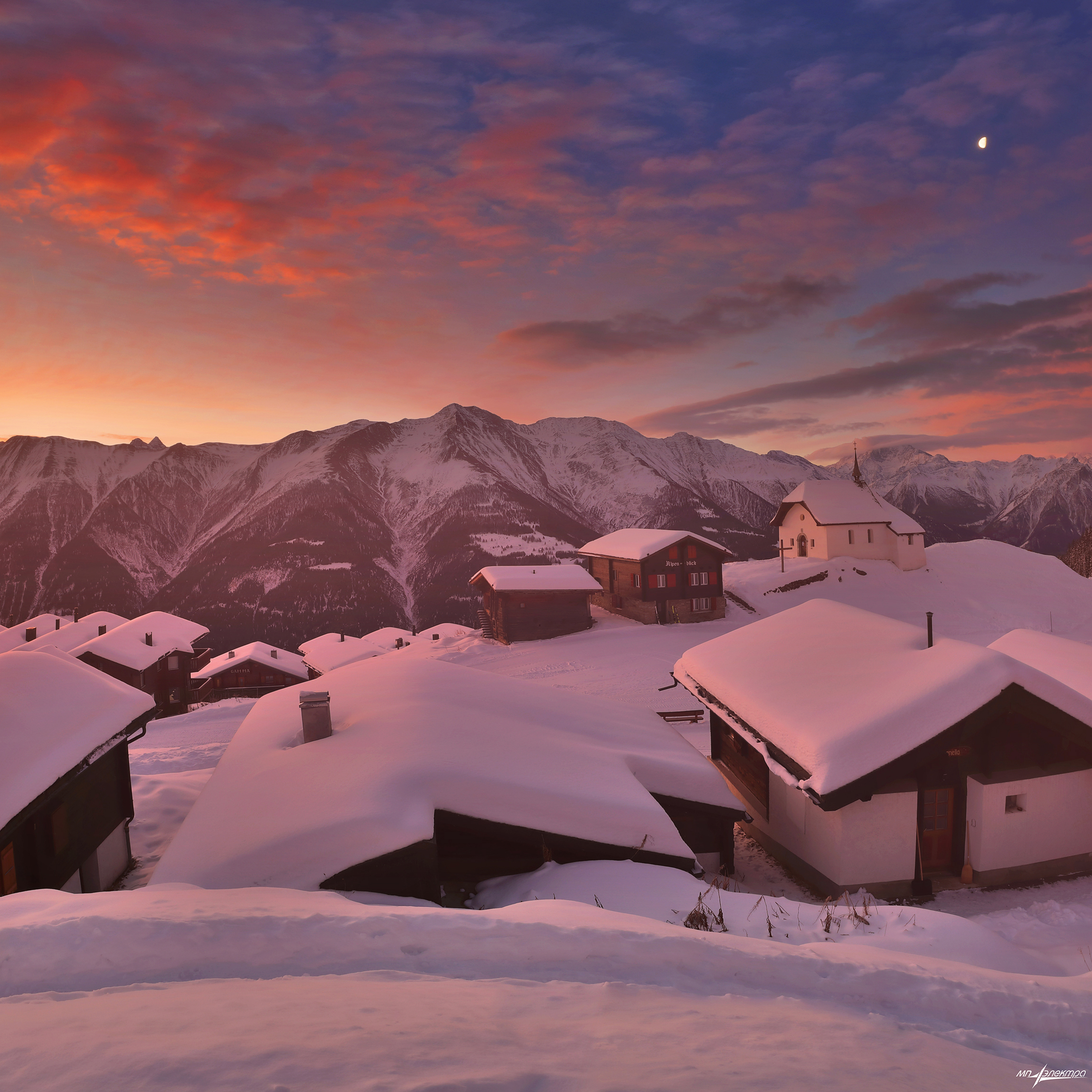 ночные дома с треугольными крышами в снегу