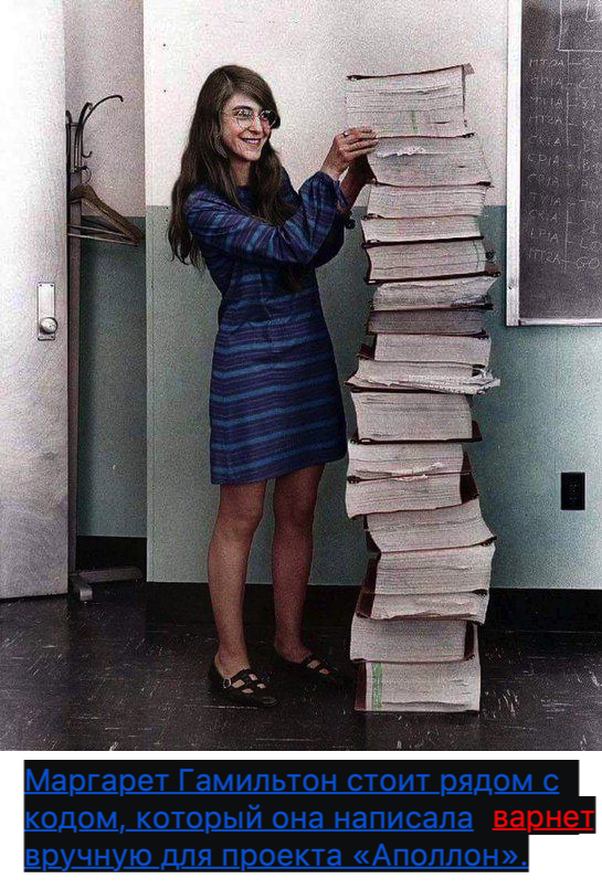 На стандартной странице A4 помещается примерно 1800 символов текста. Один символ текста это один байт. У тётеньки на картинке 16 томов кода, каждый том по 2 тысячи страниц примерно, и пусть каждая страница полная кодом 1800 символов. Тогда16*2000*1800=57,600,000 символов это вышло 57,6 мегабайт кода. Этого кода хватило на несколько лунных миссий и ещё чего-то.