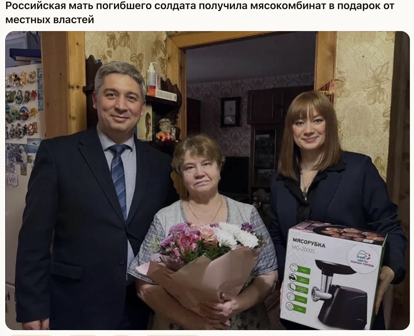Аноним 🇰🇿 7ме3н 10 марта 2025, 19:30 Подарок матери погибшего в сво - тонкая ирония чиновников России