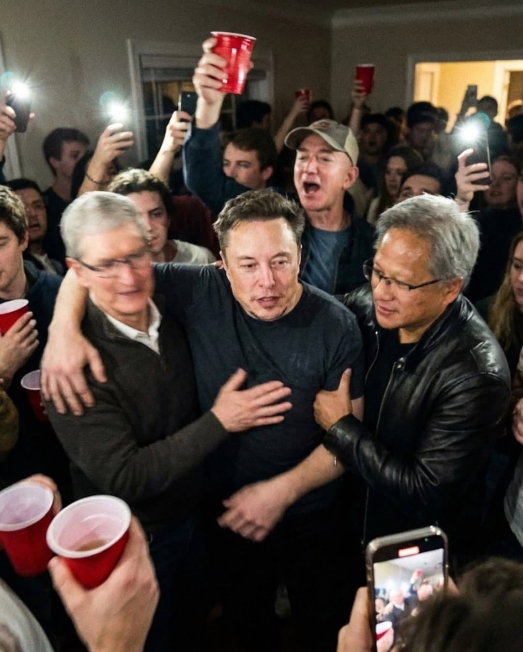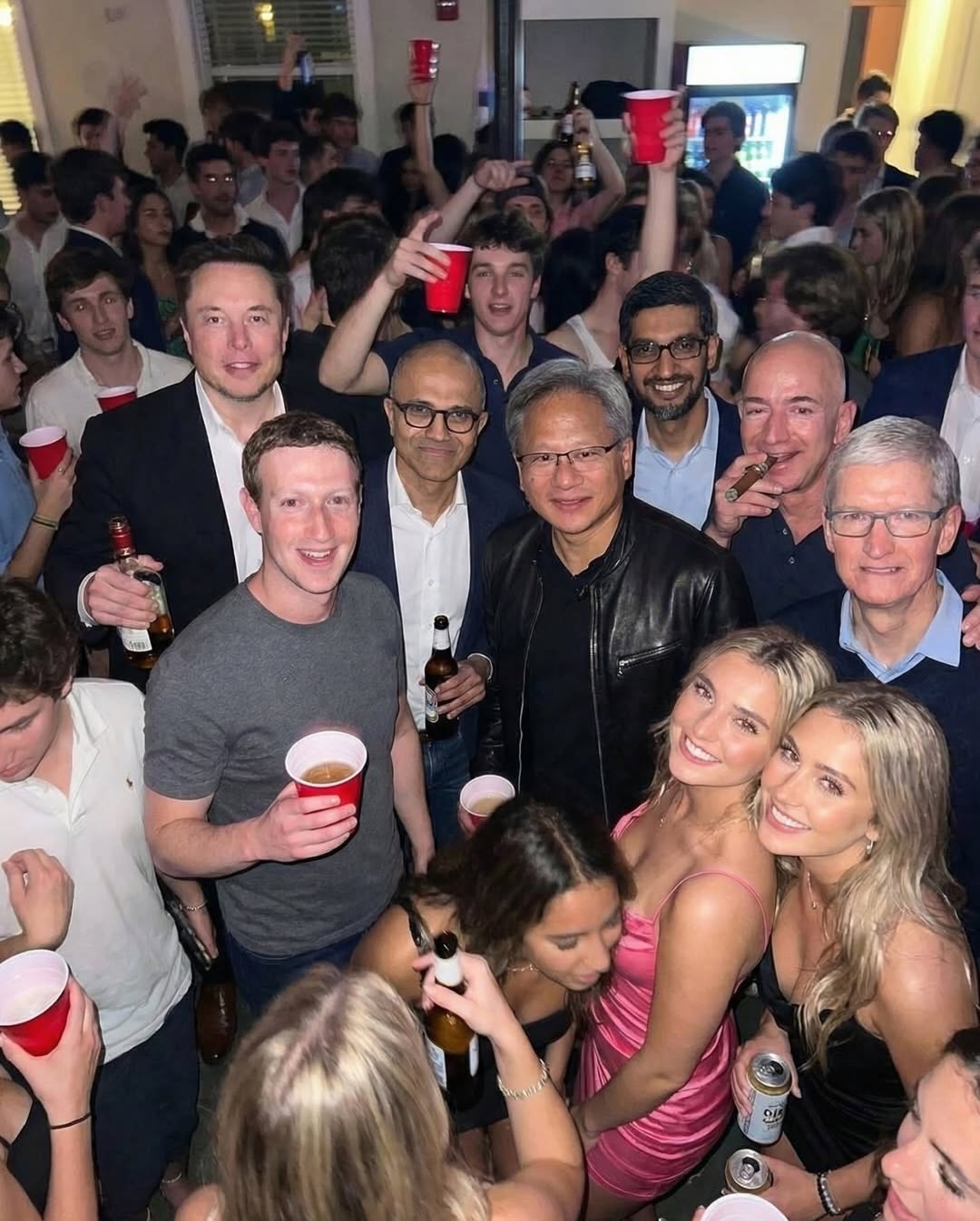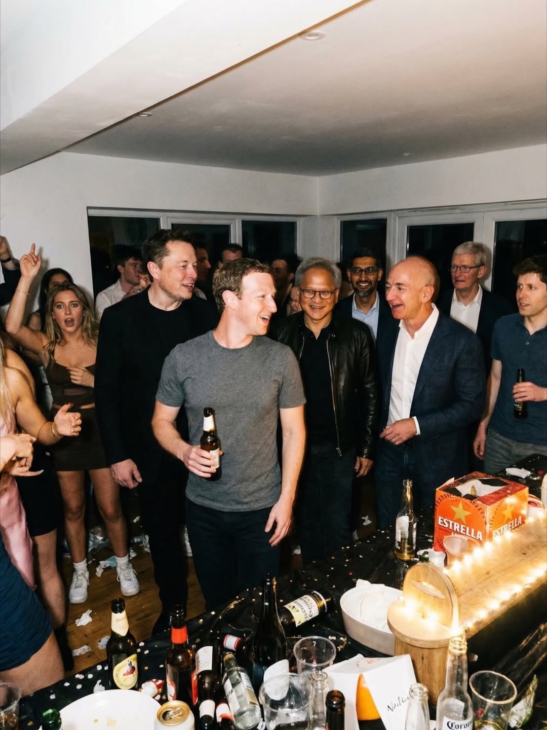 Контекстная неправдоподобность: изображенные люди являются активными бизнес-конкурентами, что делает такую случайную групповую сборку на небольшой, переполненной домашней вечеринке крайне маловероятной в реальном мире.