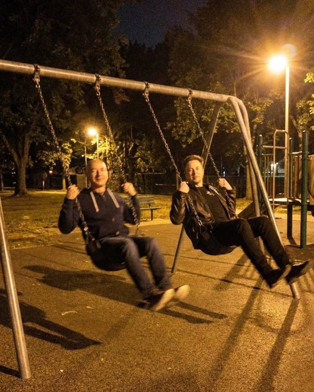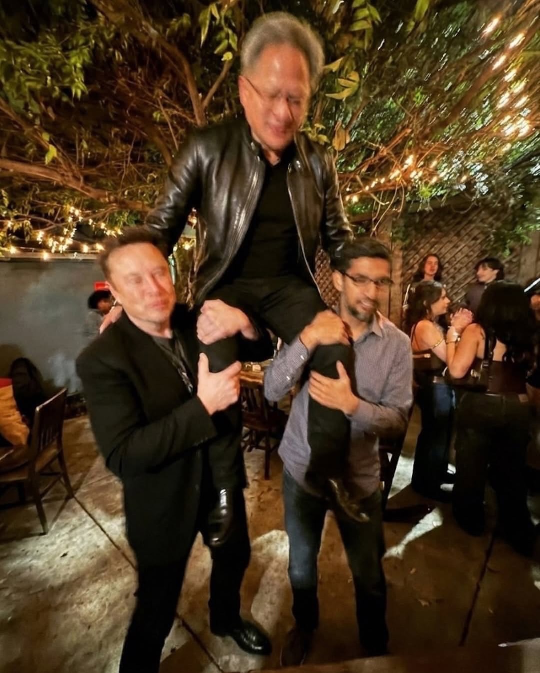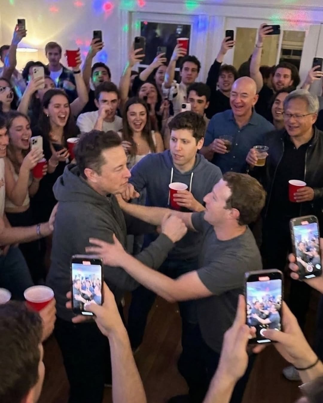Контекстная неправдоподобность: изображенные люди являются активными бизнес-конкурентами, что делает такую случайную групповую сборку на небольшой, переполненной домашней вечеринке крайне маловероятной в реальном мире.