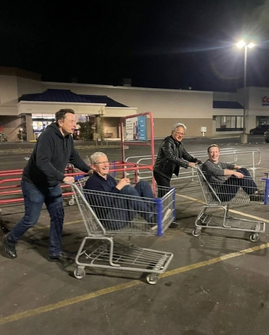 На изображении изображены несколько видных технологических руководителей и миллиардеров, в том числе (слева направо в первом ряду):