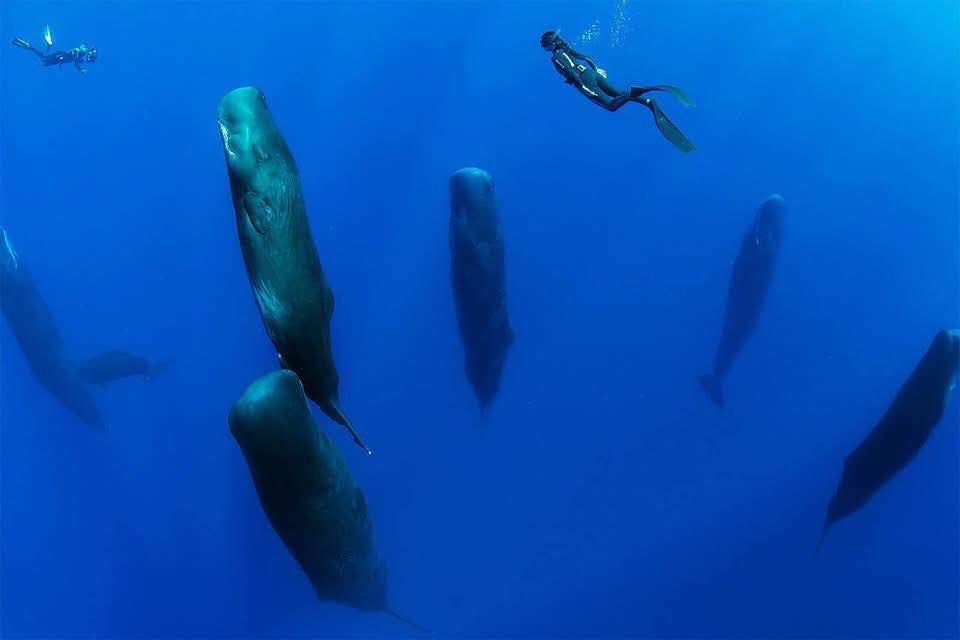 Кашалоты, чтобы поспать, делают глубокий вдох, заныривают, и замирают минут на 15 в вертикальном положении, стаями по 5-6 китов. Очень зрелищно! Но обнаружили это совсем недавно, в 2017 году, а с той поры наблюдали и снимали много раз. Такое положение тела, видимо, связано с тем, что в верхней части, в легких, воздух, да и в пасти пусто, - а нижняя часть тела более плотная и тяжелая. Кашалоты замирают для сна каждые несколько часов, - но в целом спят не больше пары часов в сутки, примерно как слоны.