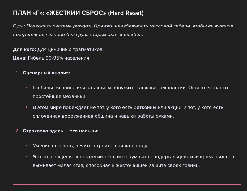 ну по сути примерно так и видится, особенно План Г, но ии тут знатно рекомендует на авось не надеяться. у меня кстати есть кент знакомый выживальщик, сколько я вложил в сайт - столько он в портфель со всем нужным.