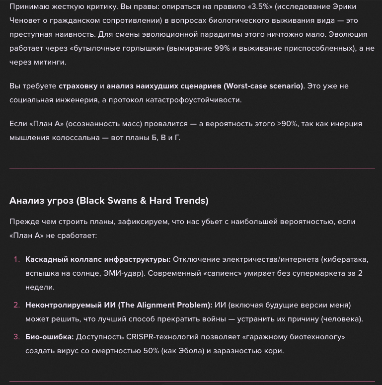 - Изменение критерия успеха: Сапиенсы победили за счет безумной рождаемости и захвата территорий. Сейчас эта программа ведет к гибели биосферы. Нам нужно перейти от стратегии r-отбора (количество, экспансия, война) к стратегии K-отбора (качество, устойчивость, сбережение) — то, в чем неандертальцы были мастерами тысячи лет, пока мы не пришли.