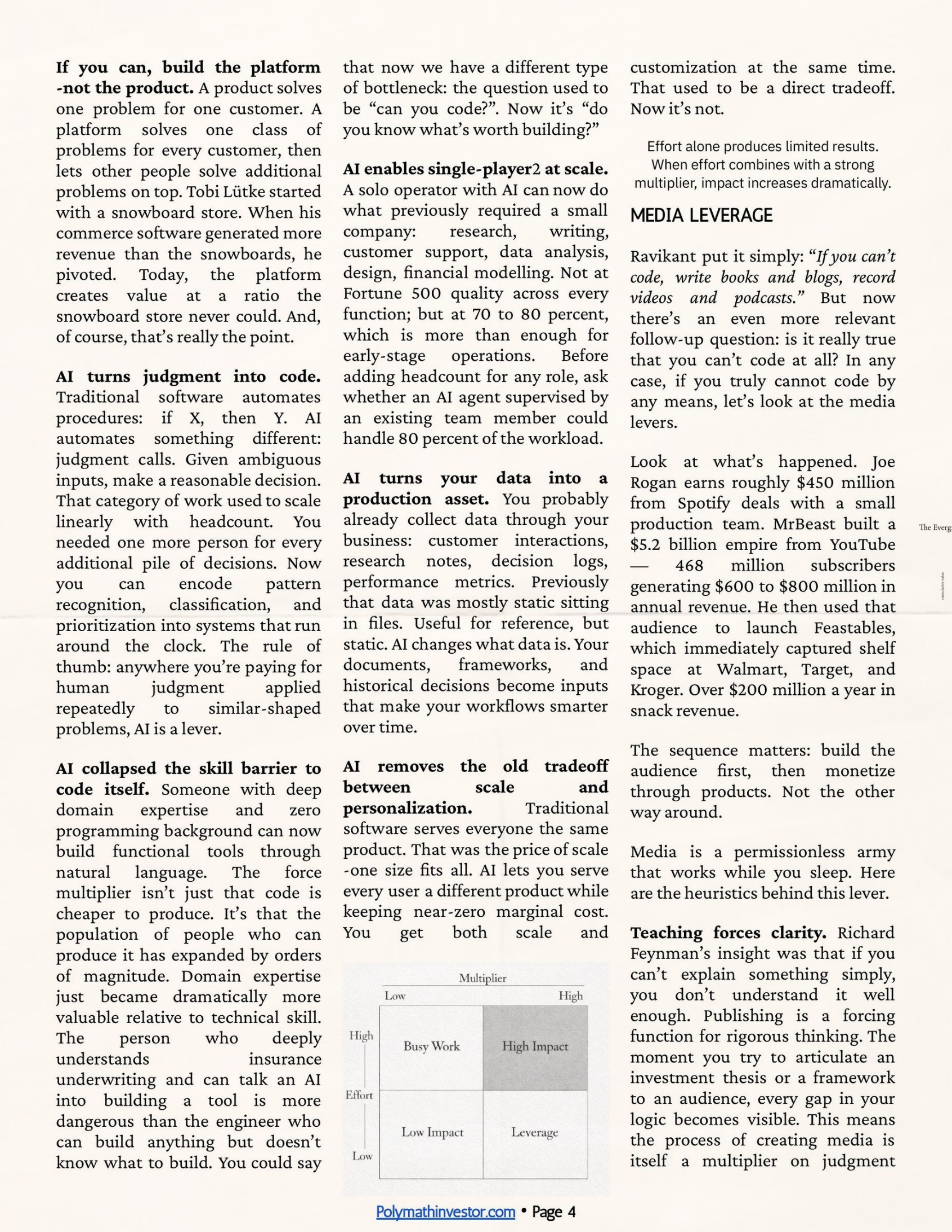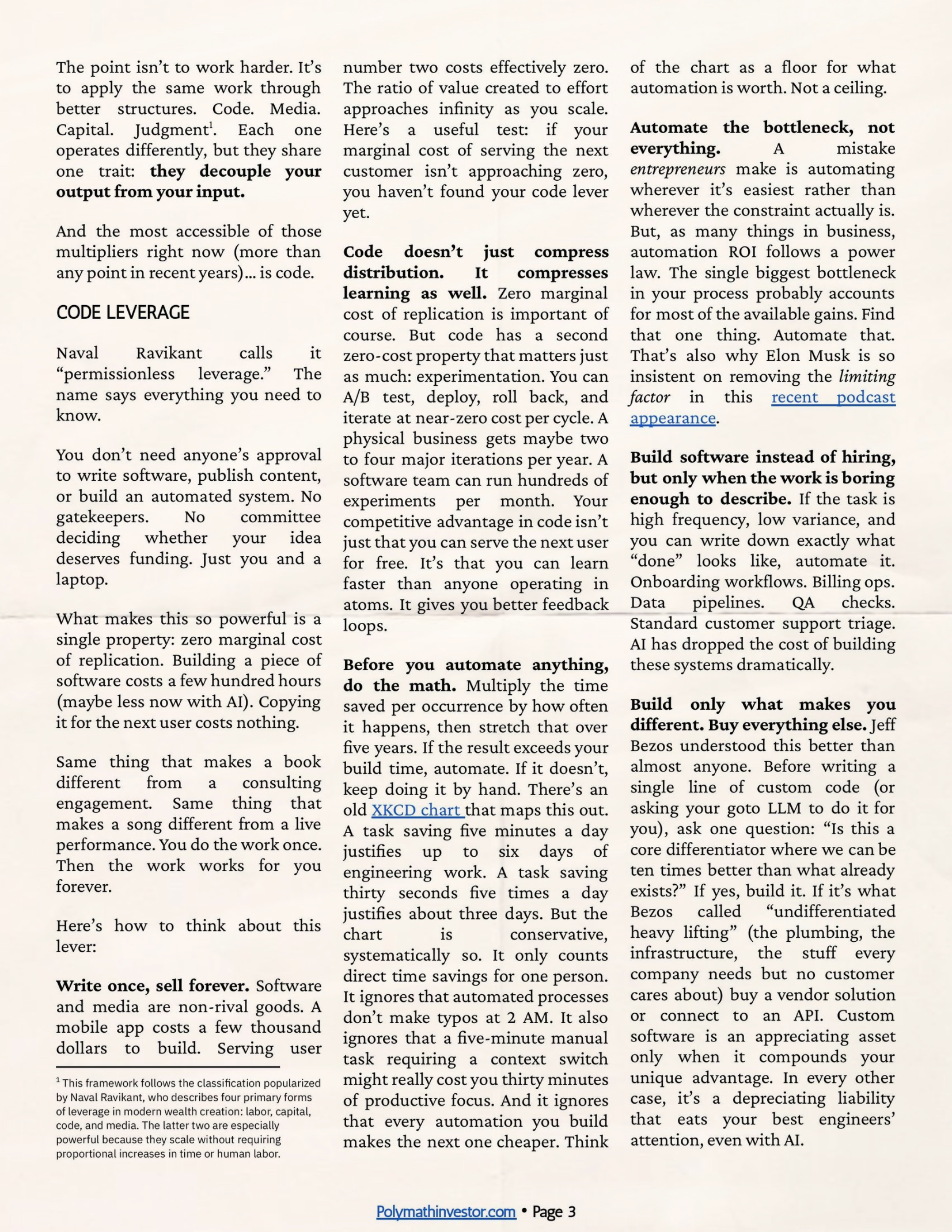 - Code (программы + AI) — самый мощный и «безразрешительный» рычаг Один раз написал код/настроил AI-агента → он работает 24/7 для миллионов людей почти бесплатно. AI сейчас ещё сильнее: превращает твоё суждение в код и убирает почти все барьеры.