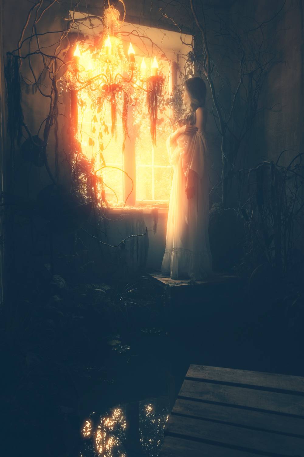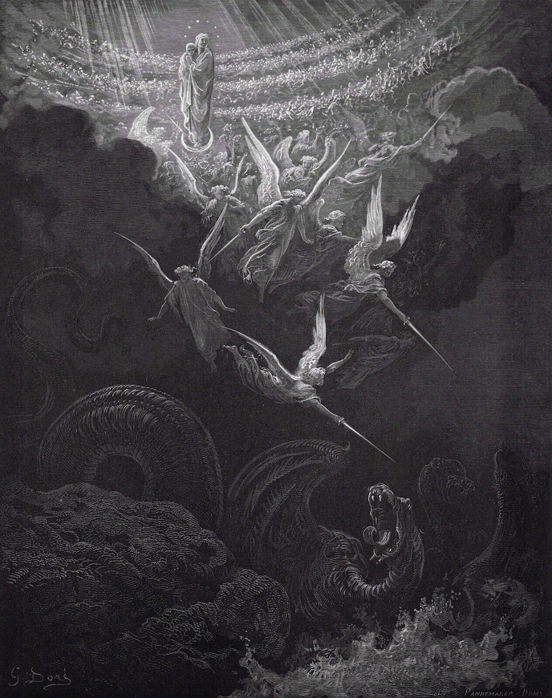 Вокруг: Ангелы, летящие над бурным океаном, что подчеркивает масштабность и драматизм небесного противостояния.