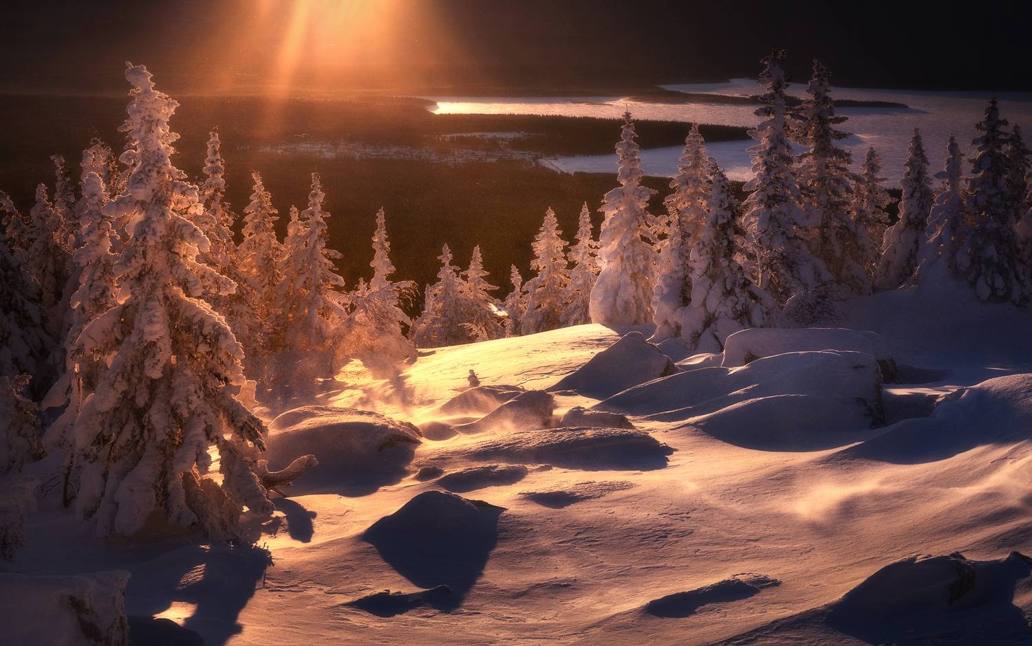 Сверху: В небе является «великое знамение» — женщина в сиянии солнца, с венцом из 12 звёзд. В христианской традиции её часто отождествляют с Девой Марией или самой Церковью.